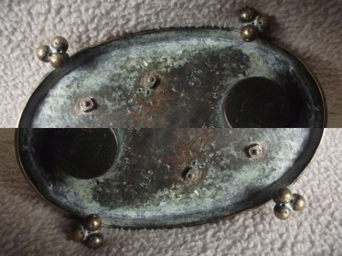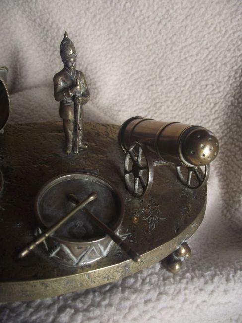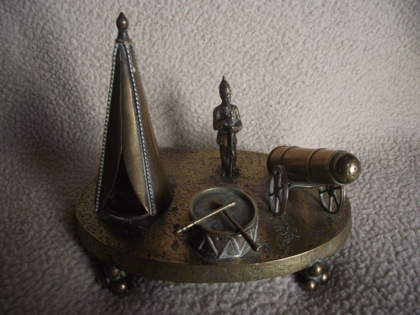 A late 19th century brass inkwell stand in the shape of a military camp with a tent which hinges back to show a glass inkwell, there is a soldier standing guard and a cannon with the detachable cannon being a pounce pot with screw on lid, to the front is a military drum with crossed drumsticks which when the lid opens there is a small gap in the rim where a pen would have been wiped, the base is oval and is raised on four legs made to look like cannonballs.
