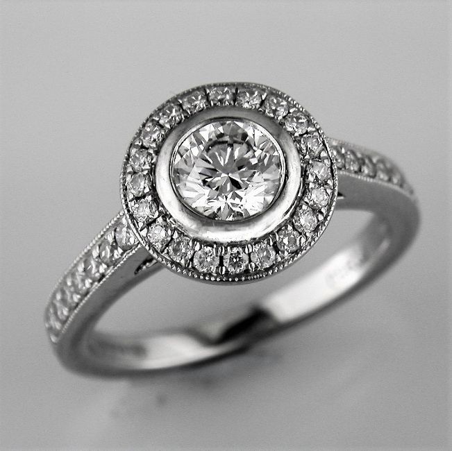 A Gorgeous Halo ring in a totally restored condition and in a Platinum Mount. The Central Diamond is in a Rubover Setting and has Diamonds surrounding  the central stone and down each shoulder.