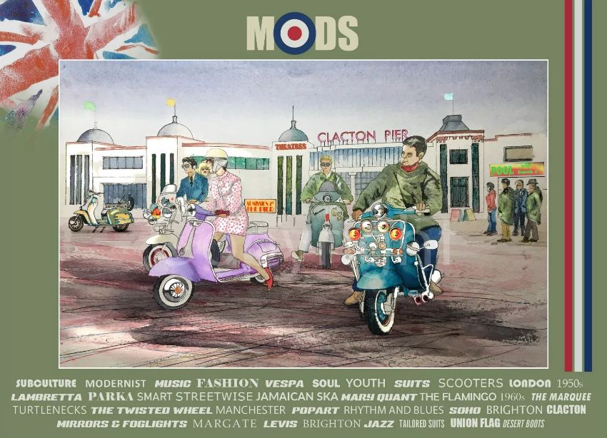 Title: Mod Gathering Clacton Pier Nostalgic 1960's Scene Metal Wall Art