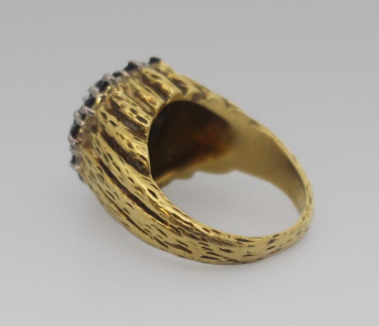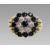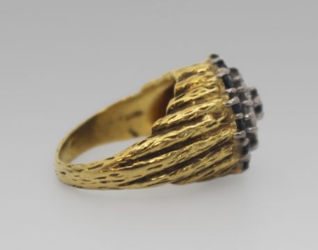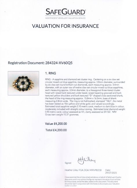 Surrounded by six claw set round brilliant cut diamonds, with an outer row of twelve claw set mixed cut blue sapphires.