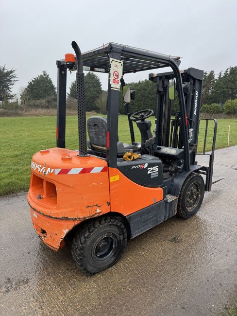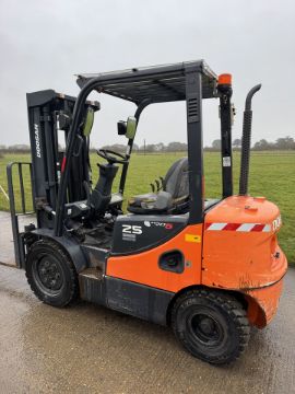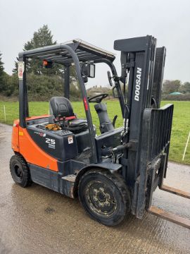 Doosan forklift truck. 2.5 Tonne lift Year 2014 Pumped up tyres all round well maintained 4.5 triple mast with side shift container spec Good condition all round