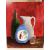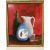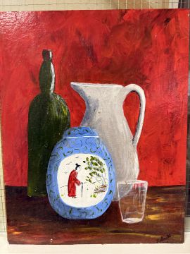 It depicts a green bottle, a white pitcher, a blue vase with an Asian-themed illustration, and a glass, set against a red background.