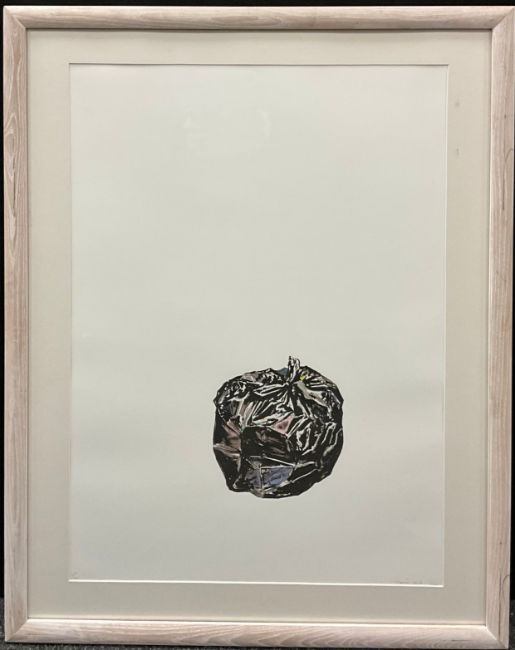 Edition Number 1/100 was donated and can be found in the V&A Museum, South Kensington. This print elevates the humble black bin liner to an object of interest and beauty, exquisitely rendered in a six-colour lithograph. More recently he has made life-like life-size sculptures of bin bags, made of black-painted bronze.