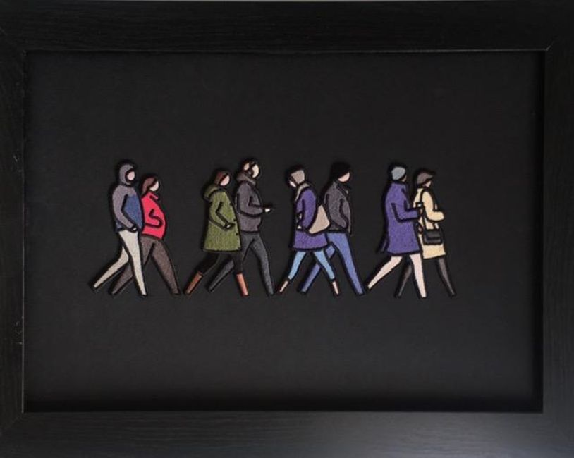 London Couples reflect this, with its 2 dimensional depth and embroidered walking images contained within a frame.