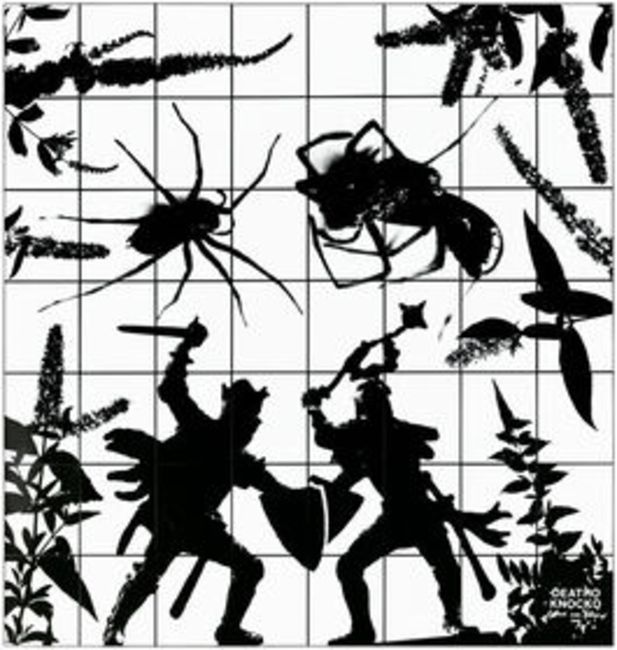 Description – Deatho Knocko Gilbert and George's black and white battle scene, showing two male knight figures with clubs, shields and swords. Above the knights are natural images of insects and plants. Date of work 1982