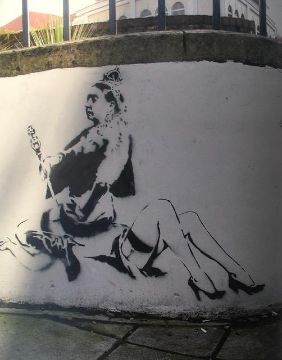 Description: Witty and subversive, his stencils show monkeys with weapons of mass destruction, policeman with smiley faces, rats with drills and umbrellas. His statements, incitements, ironies and epigrams are by turns intelligent and cheeky comments on everything from the monarchy and capitalism to the war in Iraq and farm animals.