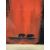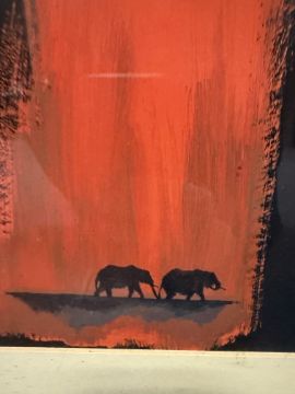 - The print depicts two silhouetted elephants against a black background with a bold red brushstroke.