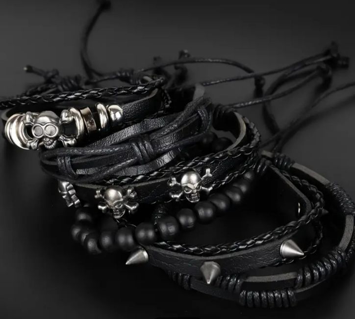 Title: New! 6 pc set of goth style PU leather & wood bead bracelets