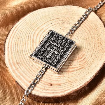 A miniature model of the Holy Bible holds the stainless steel bracelet together.