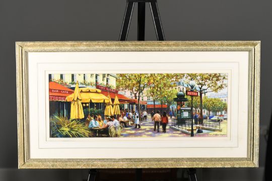 It depicts a very delightful and vibrant Parisian street scene painted with a beautiful pallet of colours.