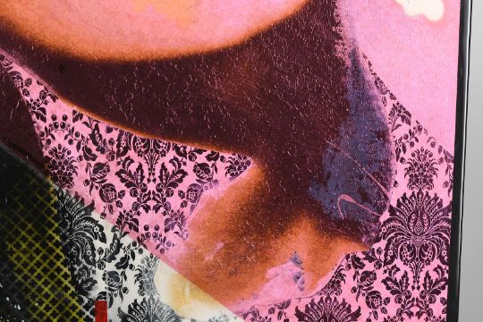 The artist has used Digital photography, graphic art, paint, spray paint, and clear resin to complete this work of art.