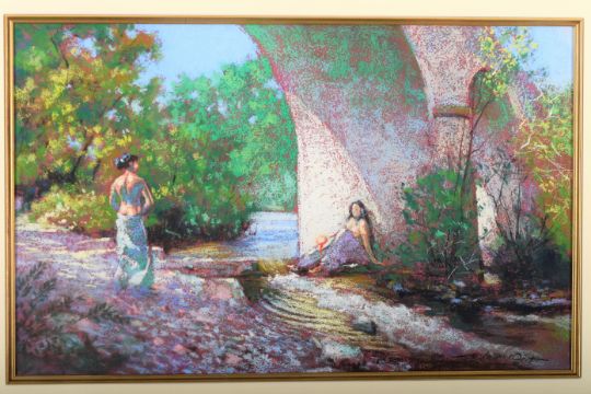 Depicting 2 bathing ladies under a viaduct.