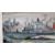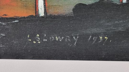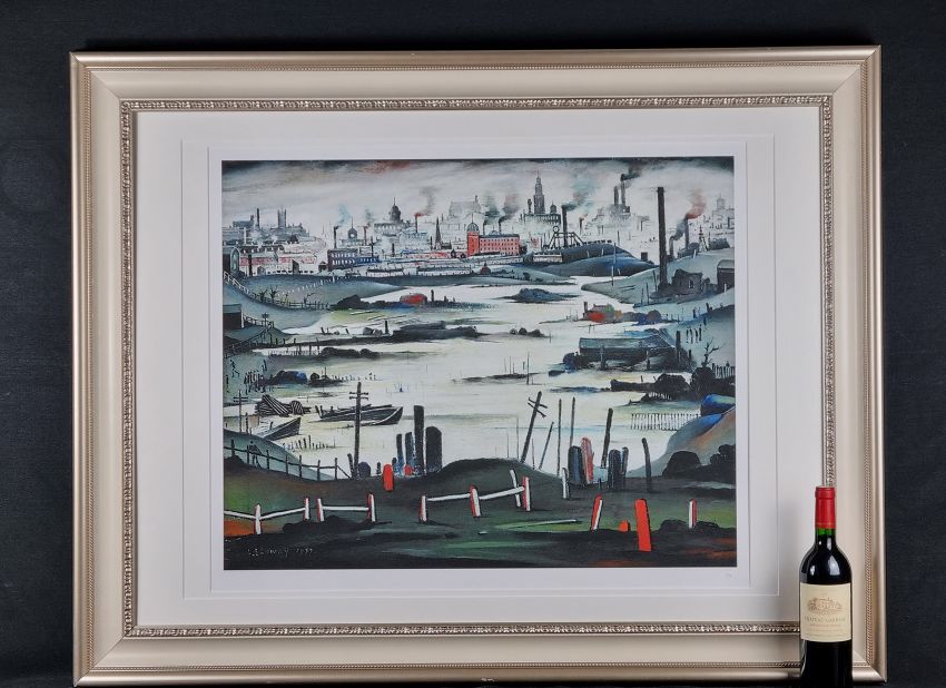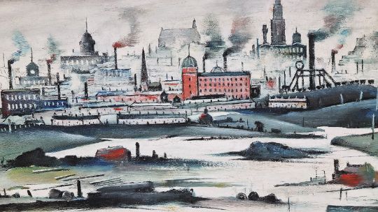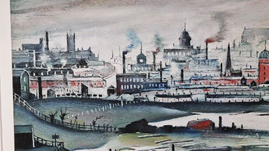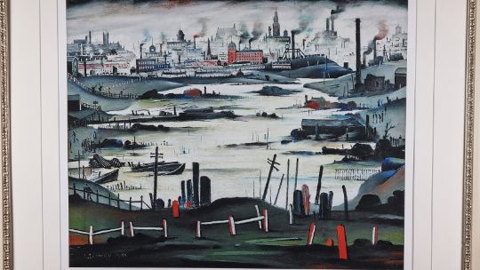 After his father's death in 1932, Lowry cared for his "bed fast" mother until her death in 1939. His paintings from this period reflect the isolation and growing despair of these years. It is possible that his mental stress and depression percolated into the painting and in a way was the reason for its bleakness. The painting depicts a moody Irwell Valley and its smoke-polluted atmosphere against an industrial background. The fences look like blood-red coloured tombstones dotted around and the telegraph poles are reminiscent of crucifixes. The water in the middle ground looks dirty and stagnant with an abandoned half-sunken boat to the left. On the left shore there are men queuing for work at a time when jobs were few and far between. On the far left is Agecroft Colliery, which was opened in 1844 but had to close in 1932 with a great loss of jobs. Lowry has intertwined churches and the town hall with the mill chimneys, which spew out black polluting smoke; it is an interesting juxtaposition of industrial architecture and residential buildings.