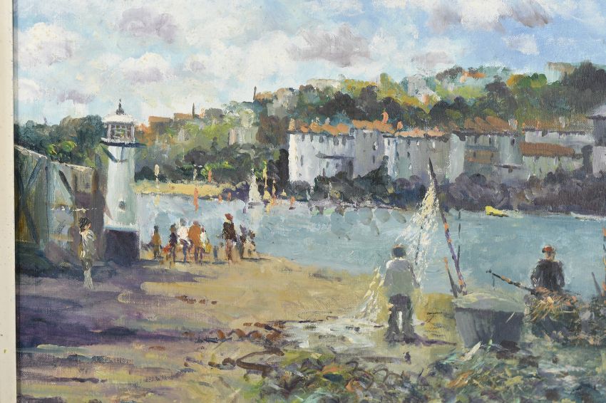 This coastal scene titled "Mending the nets, Cornwall" is stunningly framed in an expensive English bespoke hand made frame and glassed.
