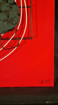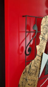 7807 - Striking metal modern art of musical instrument on painted panel.