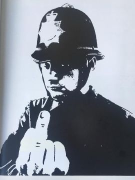 Description: Witty and subversive, his stencils show monkeys with weapons of mass destruction, policeman with smiley faces, rats with drills and umbrellas. His statements, incitements, ironies and epigrams are by turns intelligent and cheeky comments on everything from the monarchy and capitalism to the war in Iraq and farm animals.