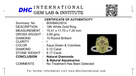 Title: Beautiful 8.17 CT Natural Aquamarine Ring With Natural Diamonds & 18k White Gold