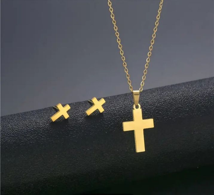 Title: New! Golden Cross Design Stud Earrings & Pendant Necklace