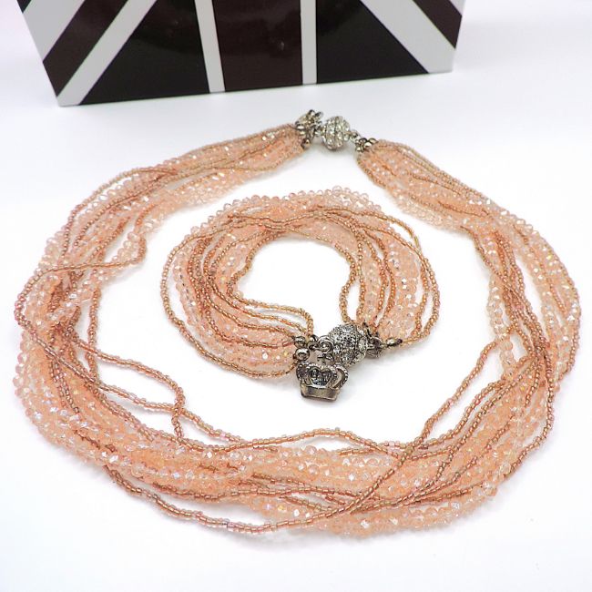 Authentic Butler & Wilson matching multi strand pink blush bead necklace and bracelet set both with crystal encrusted magnetic ball clasp.