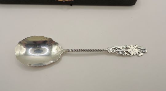 A fine quality antique 19th century silver spoon with twisted stem in original presentation case.