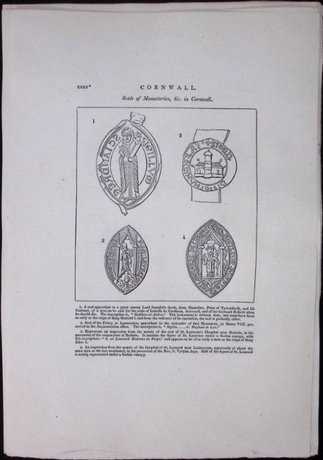 Title: Cornwall Ancient Seals Of Monasteries Rare Large Antique Copper Plate Etching