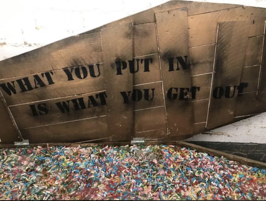 Maximilian Wiedemann "You get out what you put in, full-size Coffin Sculpture