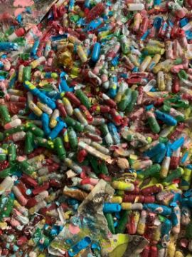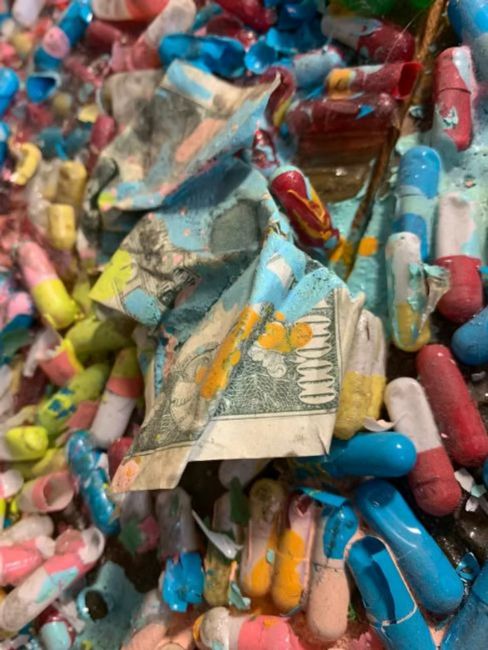 Infamous Coffin Sculture within the coffin is drugs, bullets, razor blades and other dangerous paraphernalia.