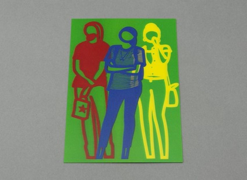 A 3D, lenticular moving image print featuring 3 standing figures created for OPIEs solo exhibition at Gallery Krobath, Vienna in 2019. Inscription and invitation to the exhibition at Gallery Krobath, Vienna in 2019, inside frame