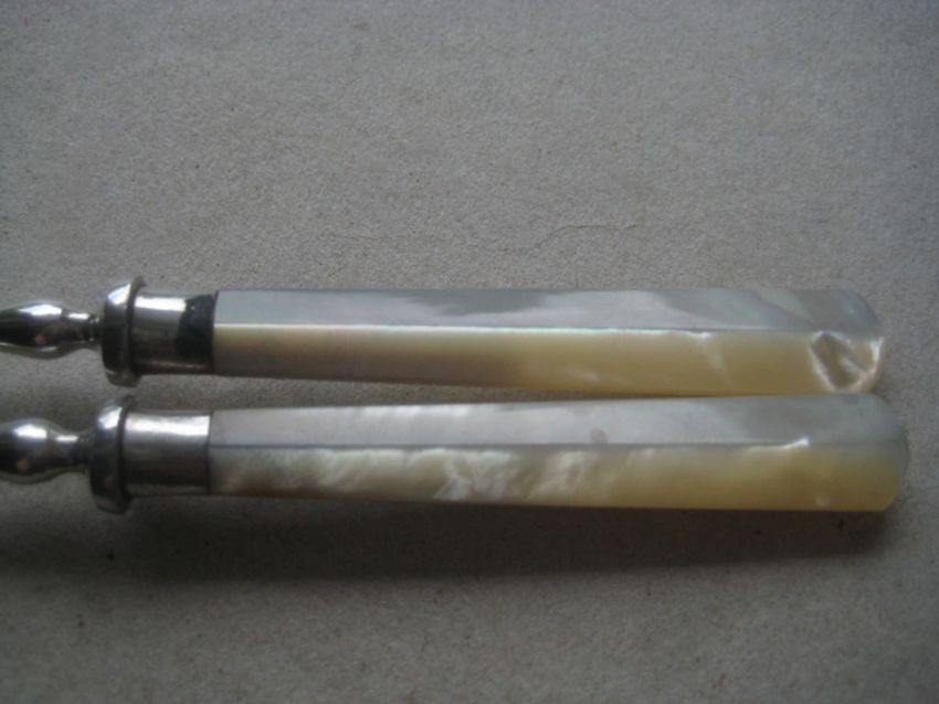 Title: Antique Pair of Mother of Pearl Hafted Silver Plated Pickle Forks