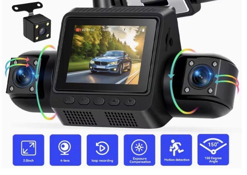Equipped with four cameras, including adjustable interior lenses, this dash cam captures multiple angles simultaneously to improve visibility and security.