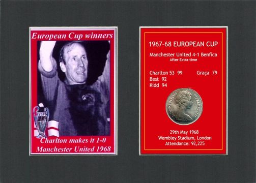 Title: Charlton Makes It 1-0 Manchester United 1968 European Cup Mounted Coin Metal Art