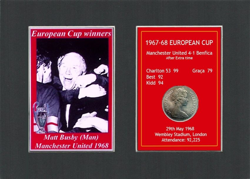 Title: Matt Busby Manchester United 1968 European Cup Mounted Coin Metal Art