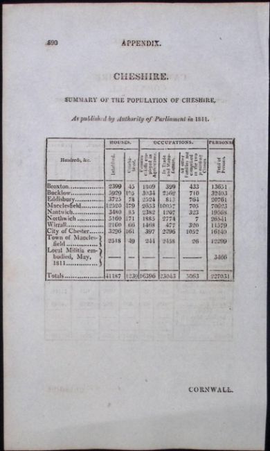 Cambridge & Cheshire Antique 207 Years-Old Georgian Population Census Scarce Print.