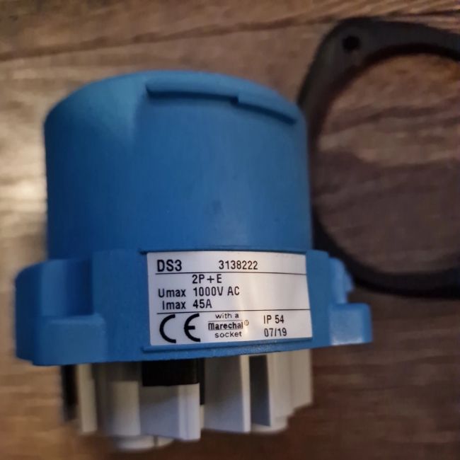 Marechal DS3 2P+E 45A 1000V IP54 industrial electrical inlet.