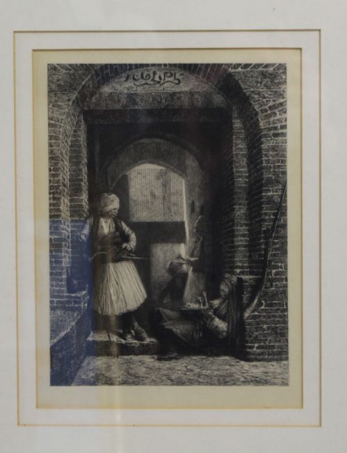 A late 19th-century etching depicting an Orientalist scene, with two male figures in traditional dress within a vaulted brick entranceway.