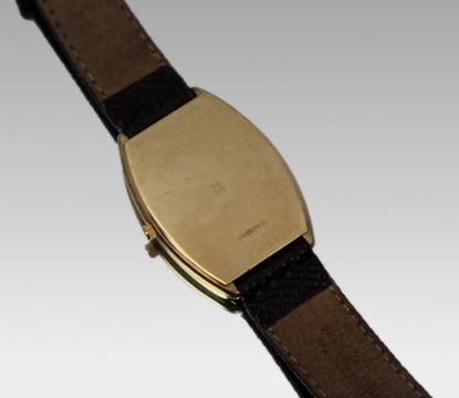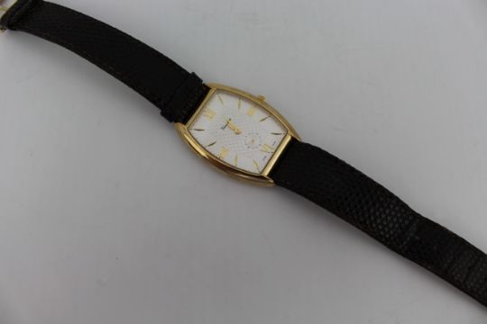 The case measures approximately 4.3 cm high by 3.1 cm wide (excluding crown), with a total length of 25 cm including strap – a smart and understated late 20th-century Swiss wristwatch in hallmarked gold, combining discreet refinement with everyday practicality.