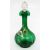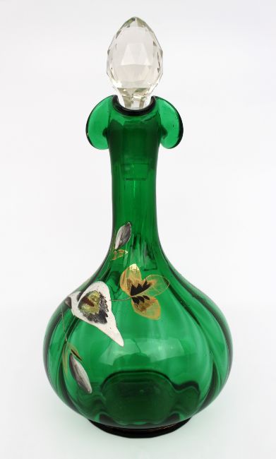 The body is richly coloured in a vibrant emerald green, with a clear applied handle and a faceted stopper.