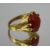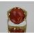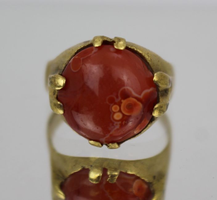 A vintage gold-tone ring, featuring a striking red and orange patterned agate cabochon held in an ornate claw setting.