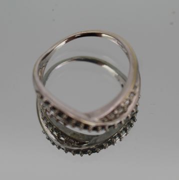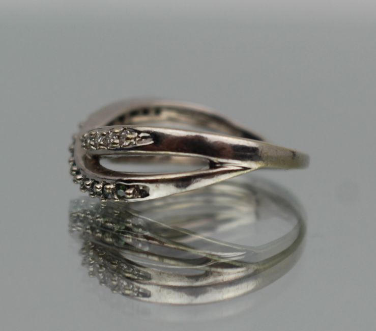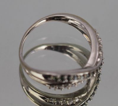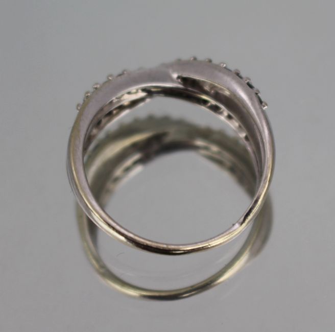 The crossover design creates an elegant twisting profile, with the stones set in fine claws along the open shoulders.