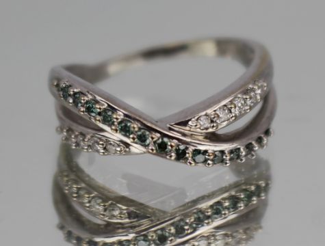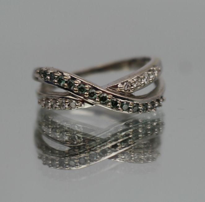 An attractive vintage ring set with alternating bands of small white diamonds and vivid green demantoid garnets.