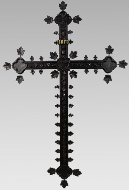 We are pleased to offer a beautifully carved 19th-century Black Forest cross featuring intricate grapevine motifs and a carved "INRI" inscription.
