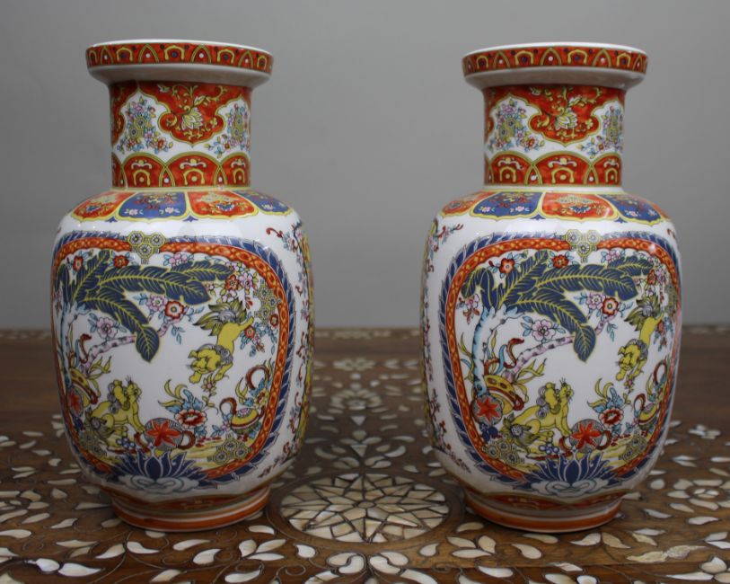 Each vase is of baluster form with flared neck and is richly decorated with traditional Chinese-inspired scenes of karakō (boys at play), shishi lion dogs and lotus flowers within shaped cartouches, surrounded by dense scrolling floral and geometric borders in iron-red, yellow, cobalt blue and gilt.
