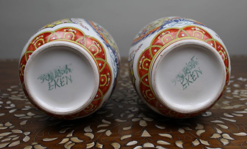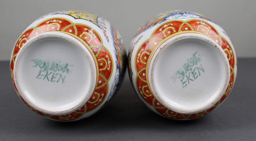 A decorative pair of vintage Japanese porcelain vases in the Kutani style, produced for export and bearing the EKEN mark to the base.