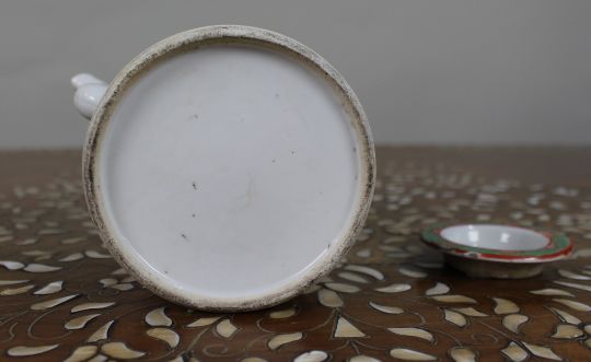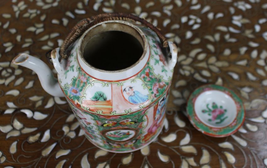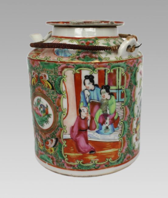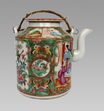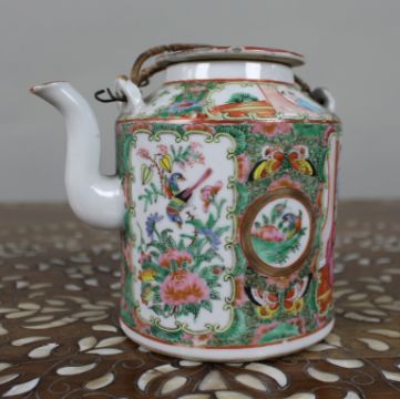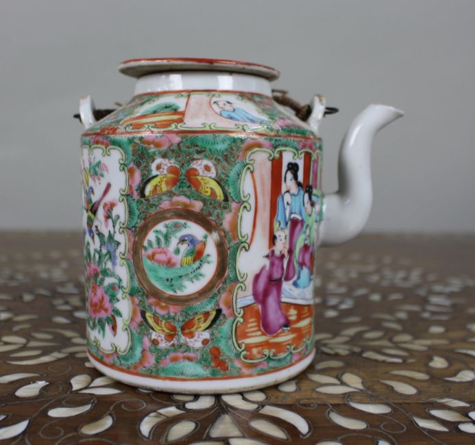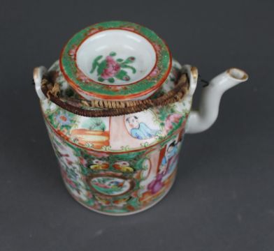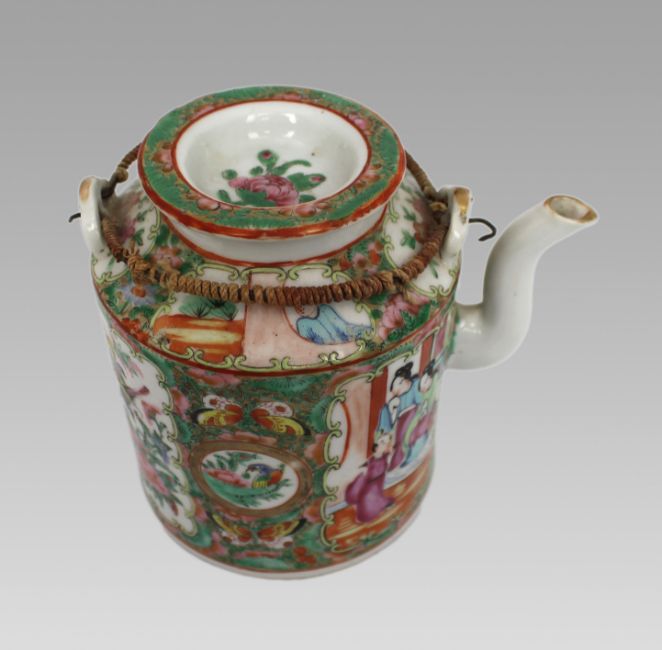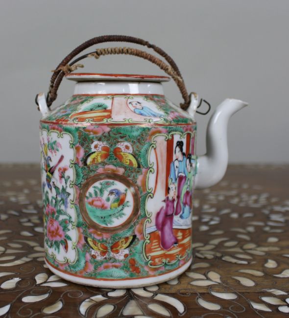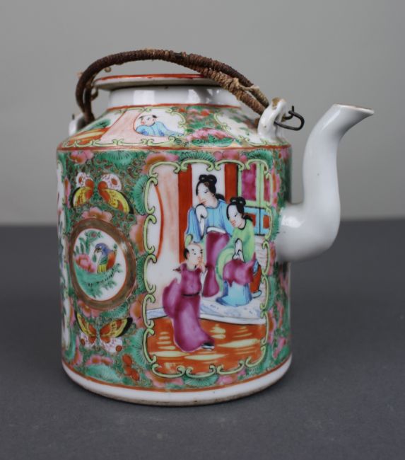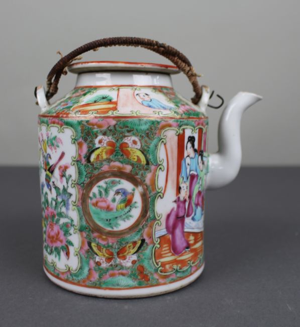 The teapot retains its original cane-wrapped swing handle, secured with metal hooks, a characteristic feature of mid-to-late 19th century export wares produced for the Western market.