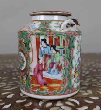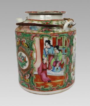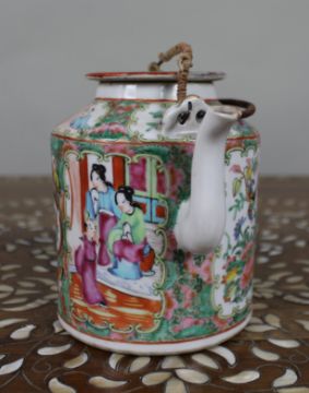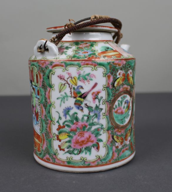 A 19th century Chinese export porcelain teapot, decorated in the Canton famille rose palette with alternating figural panels and bird-and-flower medallions, framed by dense scrolling foliate borders.