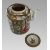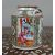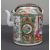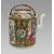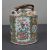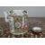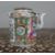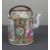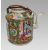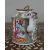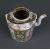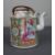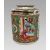 The cylindrical body is enamelled with interior scenes and stylised floral motifs, fitted with a curved porcelain spout and an original matching lid, decorated en suite.