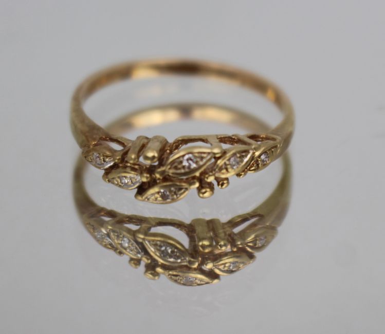 This exquisite vintage ring features a delicate, nature-inspired design with marquise-shaped settings, each adorned with sparkling diamond-like stones.