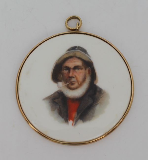 Each plaque features a finely painted bust-length portrait of an old sailor smoking a pipe, wearing traditional seafarer’s garb including a sou’wester and beard.