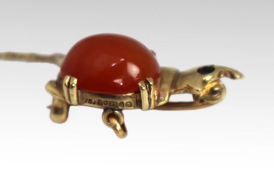 Crafted in 9ct yellow gold, the piece is set with a polished cabochon carnelian forming the body, and a small ruby to the eye.