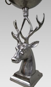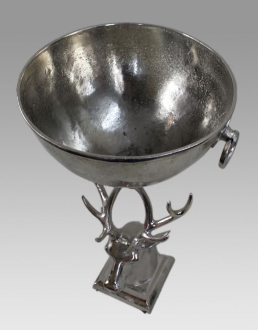 The design features a dramatic stag’s head with pronounced antlers that arch upward to support a removable circular bowl.